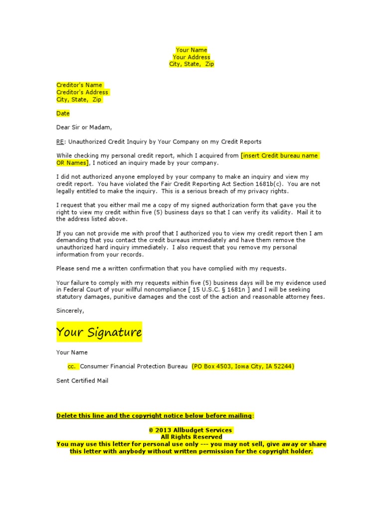 Hard Inquiry Removal Letter Credit History Copyright